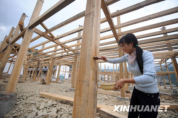 5月6日,青川縣板橋鄉浮寨村災后農房重建示范點,一位村民正在給房屋柱子上桐油。新華社記者 李曉果 攝