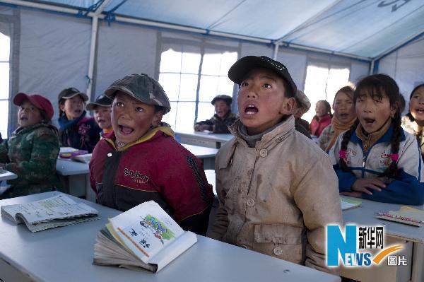 在玉樹隆寶鎮(zhèn)帳篷學校里,孩子們在教室里上課(4月27日攝)。新華社記者 劉杰攝