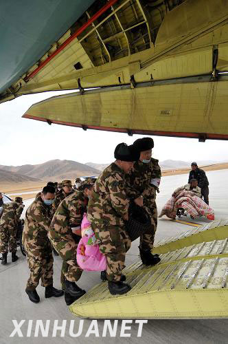 深圳邊防支隊(duì)抗震救災(zāi)醫(yī)療小分隊(duì)抵達(dá)玉樹開展救援。4月15日,在青海玉樹機(jī)場,深圳邊防支隊(duì)抗震救災(zāi)醫(yī)療隊(duì)隊(duì)員將傷員轉(zhuǎn)移上飛機(jī)。當(dāng)日13時(shí)許,廣東深圳邊防支隊(duì)抗震救災(zāi)醫(yī)療小分隊(duì)抵達(dá)青海玉樹機(jī)場,恰逢災(zāi)區(qū)一批傷員被轉(zhuǎn)移到機(jī)場準(zhǔn)備送往西寧等地救治。醫(yī)療小分隊(duì)得到消息后立即投入到轉(zhuǎn)移、救治傷員的工作中。新華社發(fā)(陳森陽 攝)