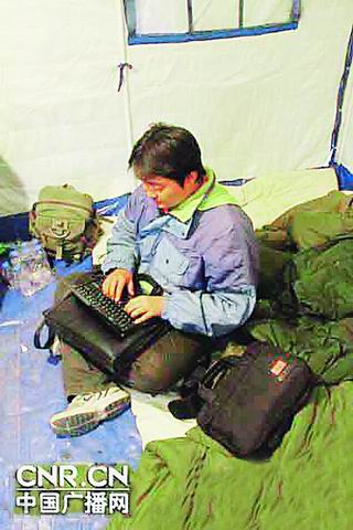 記者趙亞輝是人民日報有名的“拼命”記者。到玉樹后,第二天凌晨兩點多他才吃上第一頓飯,由于沒有熱水,吃的是干面,在頭兩天里,他僅休息了3個小時。他說:“發(fā)稿很不方便,有一次采訪完我走了一個半小時回去發(fā)稿,有篇稿子是坐在馬路上寫的,更多的時候是站著寫稿,把筆記本電池用完后,就到有柴油發(fā)電機的地方去蹭電,經(jīng)常為寫一篇稿子,在那里一站就是兩三個小時,稿子傳回社里,已是晚上十點多。”他介紹,在高海拔地區(qū)采訪,對記者是一種嚴峻的考驗,晝夜溫差很大,晚上相當冷,再加上高原反應強烈,可真不好熬。“但我們有責任把災區(qū)的狀況及時報道出去,特別是報道好救人的信息。”人民日報的讀者都還記得,趙亞輝曾參加過汶川地震報道,當時在地震發(fā)生后的4天時間里,他總共沒吃上幾口飯,平均每天休息不到兩小時,歷盡艱險,因勞累過度病倒了,在醫(yī)院輸液時,他還帶著采訪本,邊治療邊采訪醫(yī)護人員。玉樹地震后,他又主動請纓來到前線。