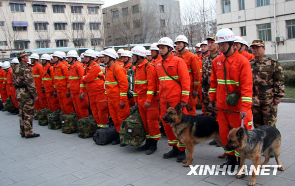 當(dāng)日,寧夏消防總隊(duì)迅速組織120名精干力量乘7輛機(jī)動(dòng)車,攜帶2只搜救犬、6種500件(套)個(gè)人防護(hù)器材、4種20件套偵檢器材、12種50件套破拆器材、8種40件套救生照明器材及通信、醫(yī)療器材和飲食物資等,前往青海省玉樹縣抗震救災(zāi)。新華社發(fā)(高軍 攝)