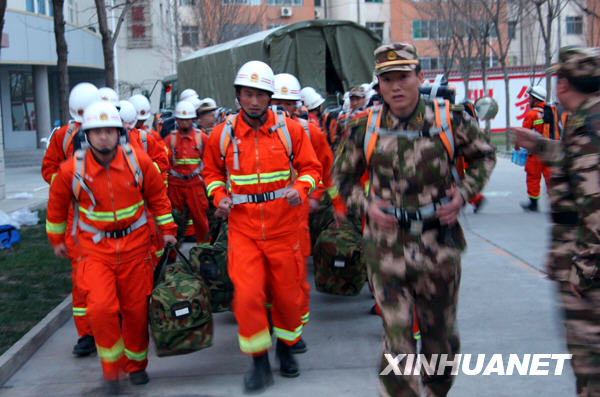 4月14日,寧夏消防總隊(duì)官兵迅速集結(jié),準(zhǔn)備趕赴青海省玉樹縣地震災(zāi)區(qū)。