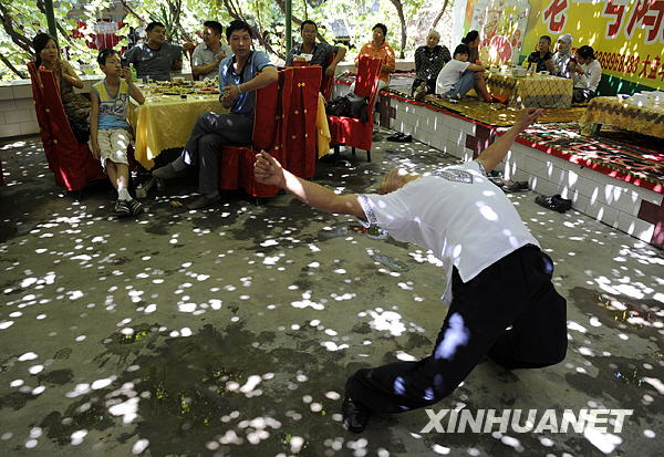 7月22日,新疆吐魯番葡萄溝的維吾爾族村民和來自西安的游客一起跳“麥西來甫”(一種傳統的維吾爾族歌舞形式)。著名旅游景區新疆吐魯番葡萄溝的維吾爾族村民載歌載舞,歡迎來自各地的游客。新華社記者戴旭明攝