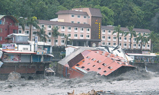 昨天中午11時38分,有22年歷史的金帥飯店,不敵激濁的山洪,在對岸圍觀群眾驚叫聲中,瞬間倒入知本溪中,附近十棟民宅與商店也被沖走;海岸山脈另一頭的紅葉溫泉全部被埋在泥石流里。