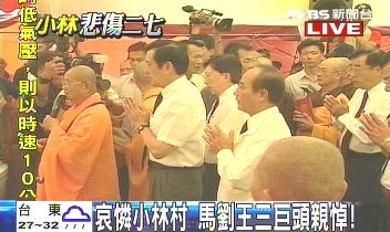 馬英九、臺(tái)當(dāng)局“行政院長(zhǎng)”劉兆玄和臺(tái)灣“立法院長(zhǎng)”王金平等人,22日上午參加高雄縣甲仙鄉(xiāng)小林村罹難者祈福追思法會(huì)。來源:臺(tái)灣TVBS電視臺(tái)