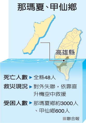 前進那瑪夏鄉的臺灣海軍陸戰隊特搜隊也傳回佳音,那瑪夏鄉的民族村和民權村都還完整,兩村各有200多人和300多人也都安全,陸戰隊官兵立刻向臺軍南部指揮中心回報坐標,今天清晨等待直升機救援。