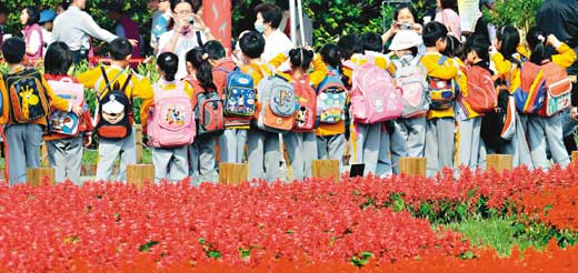參加“校外教學”的小朋友,在花博新生園區花海前拍照 圖片來源:臺灣《聯合報》