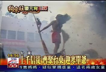 據了解,昨天的陣頭繞境是在臺東市的南北向道路上,今天則是東西向街道,今天晚間7時30分,隊伍將陸續進入臺東市天后宮表演“謝神”后解散;“炮炸寒單爺”今天還有7場次,最熱鬧一場是將于今晚7時在臺東海濱公園舉辦的“南蜂炮、北天燈、東寒單”的大會師。(云鵬) |