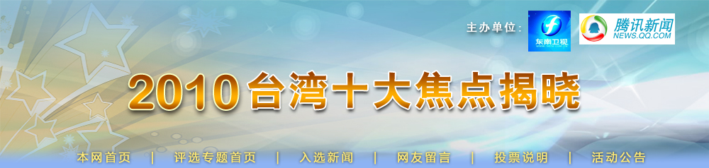 1、請(qǐng)您在備選項(xiàng)前的框內(nèi)打勾,最多不得超過10項(xiàng)。請(qǐng)?jiān)陧撁嫦路教顚憘(gè)人詳細(xì)信息,供主辦單位抽取幸運(yùn)網(wǎng)友之用,其中打*的選項(xiàng)為必填項(xiàng)目。 2、投票起止時(shí)間:2010年12月27日?D?D2011年1月7日。投票將于1月7日下午17:00截止,1月9日公布評(píng)選結(jié)果。 3、由于評(píng)選活動(dòng)舉辦過程中,主辦方采納廣大網(wǎng)友和專家意見,對(duì)候選新聞條目進(jìn)行了合并和增減,如果網(wǎng)友投票時(shí)選擇的5條或以上新聞與最終評(píng)出的“十大焦點(diǎn)”一致,將有機(jī) 會(huì)參加主辦方的抽獎(jiǎng)活動(dòng)。在評(píng)選結(jié)果揭曉的一周內(nèi),主辦方將抽幸運(yùn)網(wǎng)友30名,贈(zèng)送精美獎(jiǎng)品。屆時(shí)請(qǐng)網(wǎng)友登陸中國臺(tái)灣網(wǎng)查詢獲獎(jiǎng)情況。