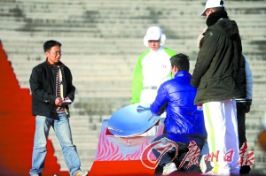 昨天的北京一掃前日的大霧氣,天高云淡,寒風(fēng)凜冽。在世紀(jì)壇靠近頂端的臺(tái)階上,搭建了一個(gè)紅色的采火臺(tái)。17名少女身著白色的羽絨衣,列隊(duì)演練,不斷熟練地跟隨采火使者緩緩步下臺(tái)階的節(jié)奏和路線。看起來(lái),她們中不止一人來(lái)自新疆。但只有一名長(zhǎng)發(fā)女子一直在周嘉威周?chē)磸?fù)演練采火的動(dòng)作與行進(jìn)的路線。