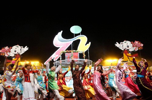 9月6日,在銀川寧夏體育場(chǎng)舉行的民運(yùn)會(huì)開(kāi)幕式文藝表演中,演員們伴著樂(lè)曲載歌載舞。當(dāng)日,第七屆全國(guó)少數(shù)民族傳統(tǒng)體育運(yùn)動(dòng)會(huì)在寧夏回族自治區(qū)首府銀川市隆重開(kāi)幕。新華社記者攝
