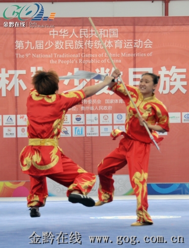 9月14日上午,第九屆全國少數民族傳統體育運動會武術男子、女子對練項目分別在貴陽開賽,共有男子12對、女子5對參賽。