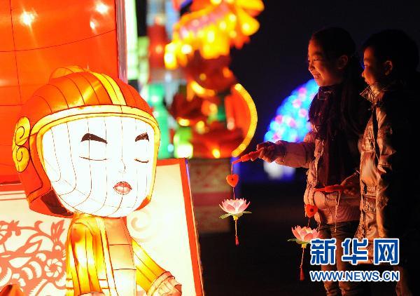 2月15日,孩子們手提荷花燈在南京中華門城墻上看燈展。當日是農歷正月十三——傳統的“上燈日”。秦淮國際燈會展區之一的南京中華門舉行提燈迎元宵活動。 新華社記者孫參攝