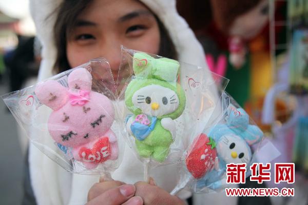2月2日,一名女孩在地壇春節(jié)文化廟會(huì)上展示兔造型的棒棒糖。 當(dāng)日,在北京春節(jié)文化廟會(huì)上,很多游客用可愛的兔飾品裝扮自己,商戶們也擺出各種各樣的兔玩具招攬顧客,為熱鬧的廟會(huì)增添了喜慶氣氛。 新華社發(fā)(陳曉根 攝)