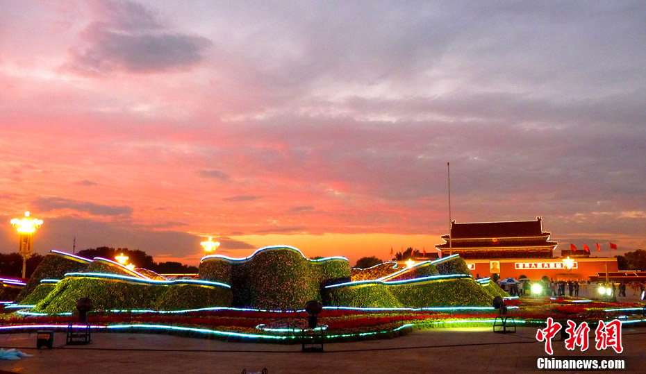 9月21日傍晚,北京天安門廣場,剛剛布置完畢的國慶中心花壇首次調試景觀照明,綻放的“牡丹”與晚霞交相輝映。 中新社發 玉龍 攝 圖片來源:cnsphoto