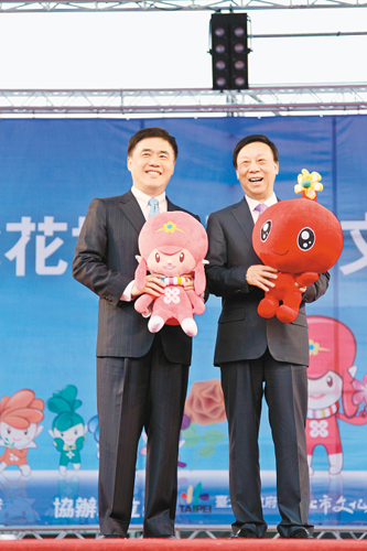 陜西省委常委、西安市委書記孫清云與臺北市市長郝龍斌為落戶臺北花博會園區的“長安花”揭幕