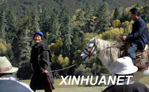 資料圖片:西藏林芝魯朗鎮(zhèn)的巴桑阿媽牽著自家的馬帶領(lǐng)游客觀光(2007年10月25日攝)。新華社記者 格桑達瓦 攝