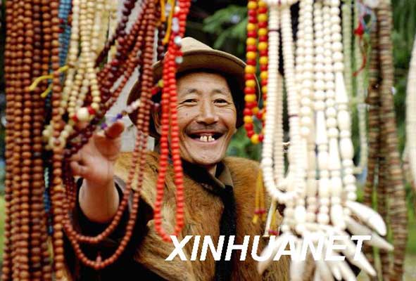 資料圖片:2007年9月15日,西藏林芝地區(qū)的一名藏族農(nóng)民在推銷旅游產(chǎn)品。 新華社記者 普布扎西 攝