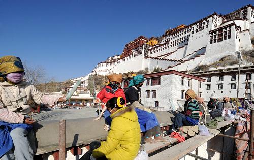資料圖片:3月21日,藏族工人正在維修布達拉宮腳下的圍墻。新華社記者 覺果 攝