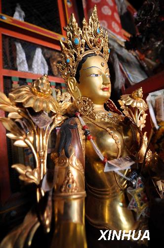 資料圖片:這是薩迦寺內(nèi)重要文物之一——綠度母像(2008年11月28日攝)。國家投資8600萬元的西藏薩迦寺維修工程已經(jīng)完成了近80%,預(yù)計2009年將完成全部維修任務(wù)。薩迦寺始建于1073年,是藏傳佛教薩迦派主寺。新華社記者覺果攝